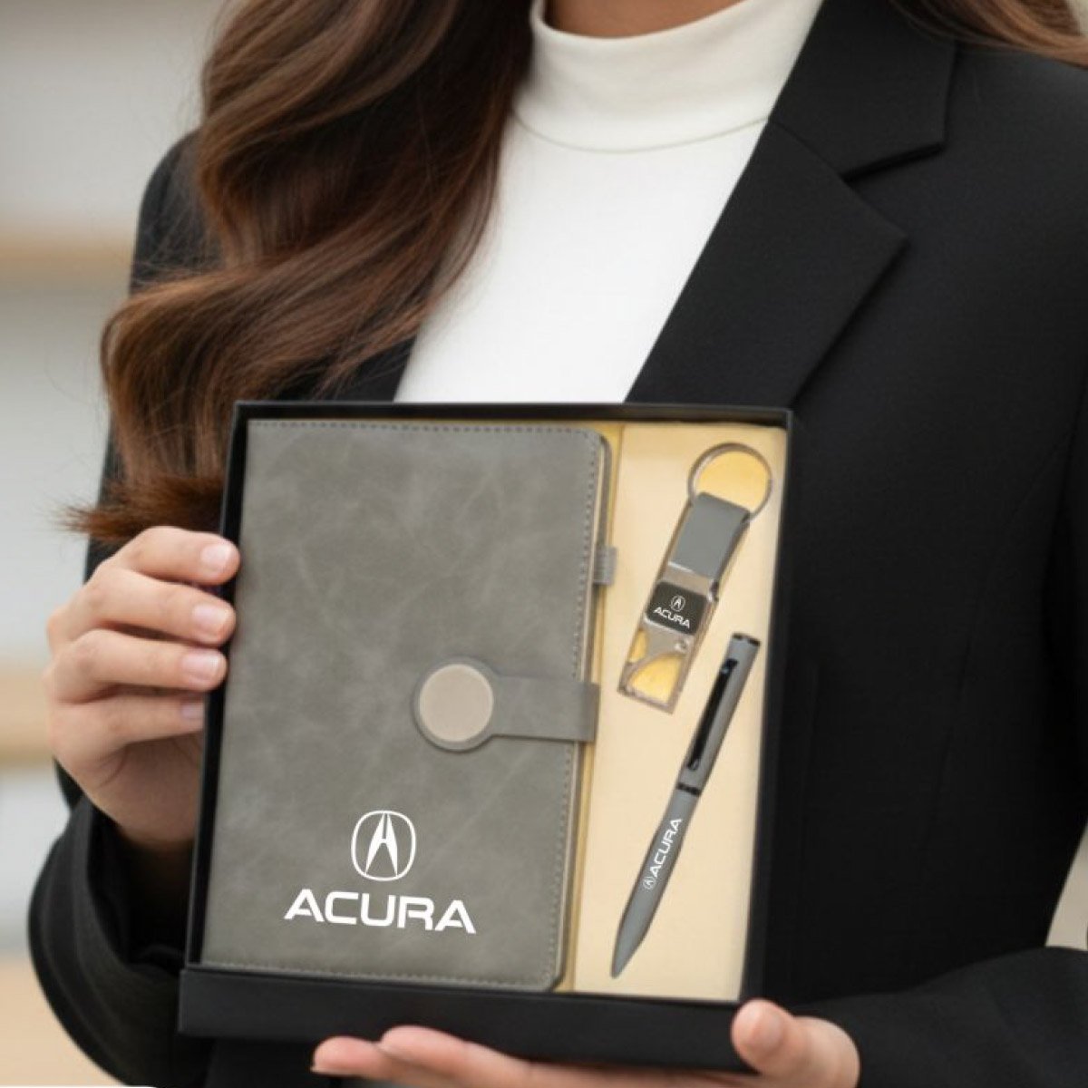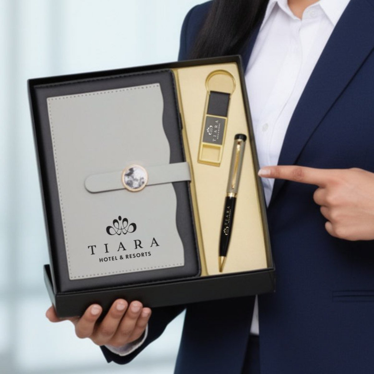Best Gift Options For Employee, Executive, Customers etc. This Set has A5 Notebook, Metal Keychain & Metal Pen. Your Logo Branding Possible on it.