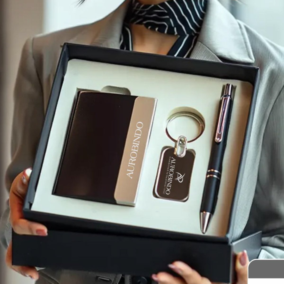 Best Gift Options For Employee, Executive, Customers etc. This Set has Card Holder, Metal Key Chain & Metal Pen. Your Logo Branding Possible on it.
