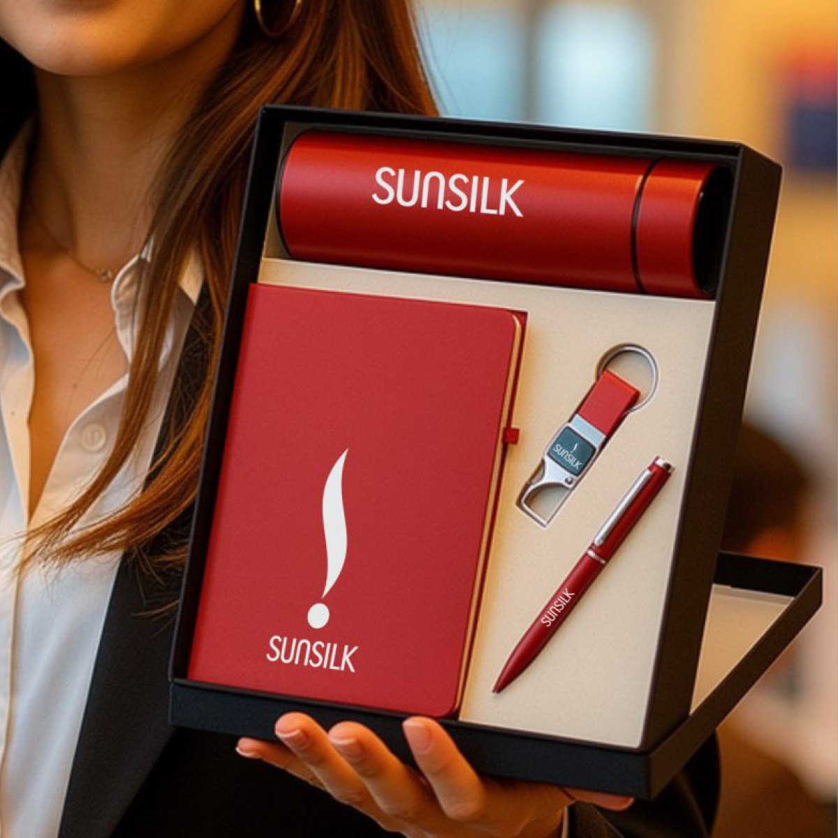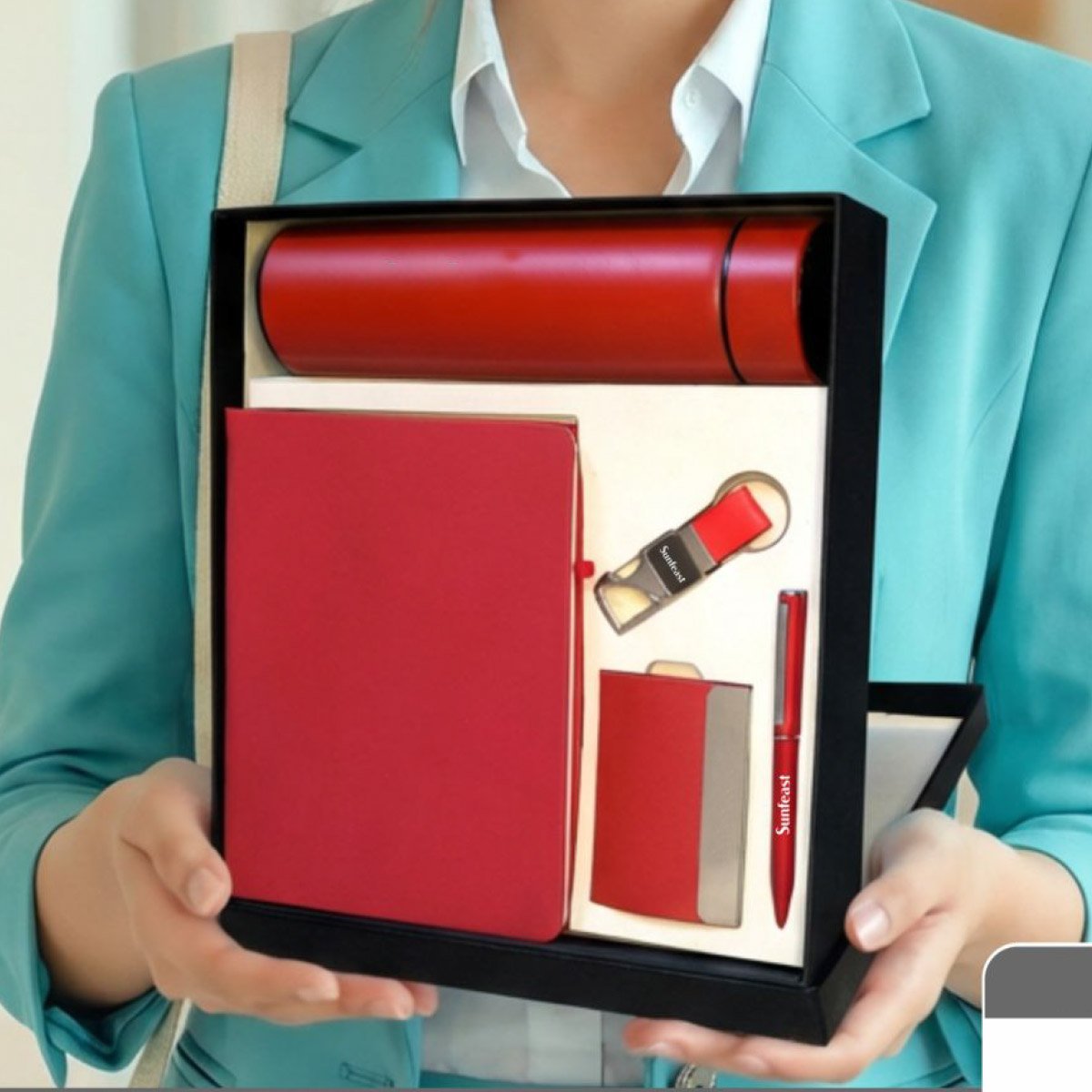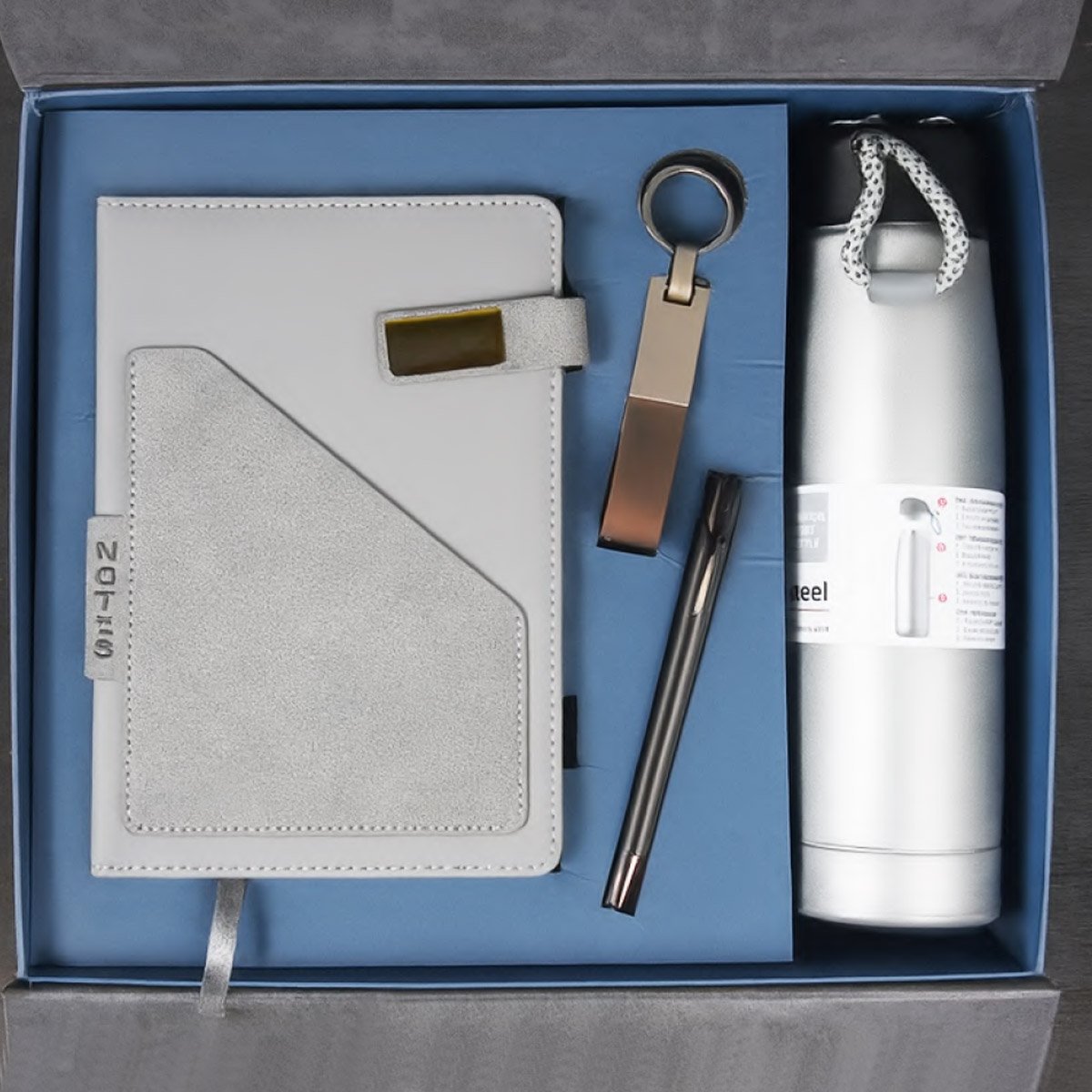 Best Gift Options For Employee, Executive, Customers etc. This Set has A5 Notebook, Key Chain, Temp. Bottle & Pen Your Logo Branding Possible on it.