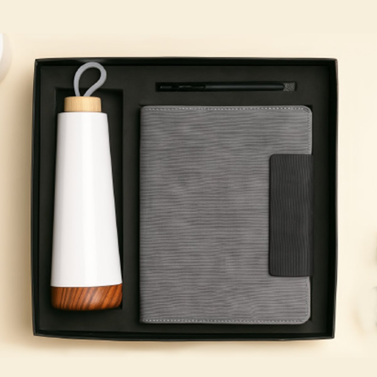 A sleek and sophisticated gift set designed for modern professionals. Featuring a refined grey and white palette with natural wood accents, this set is perfect for daily office use and thoughtful corporate gifting.